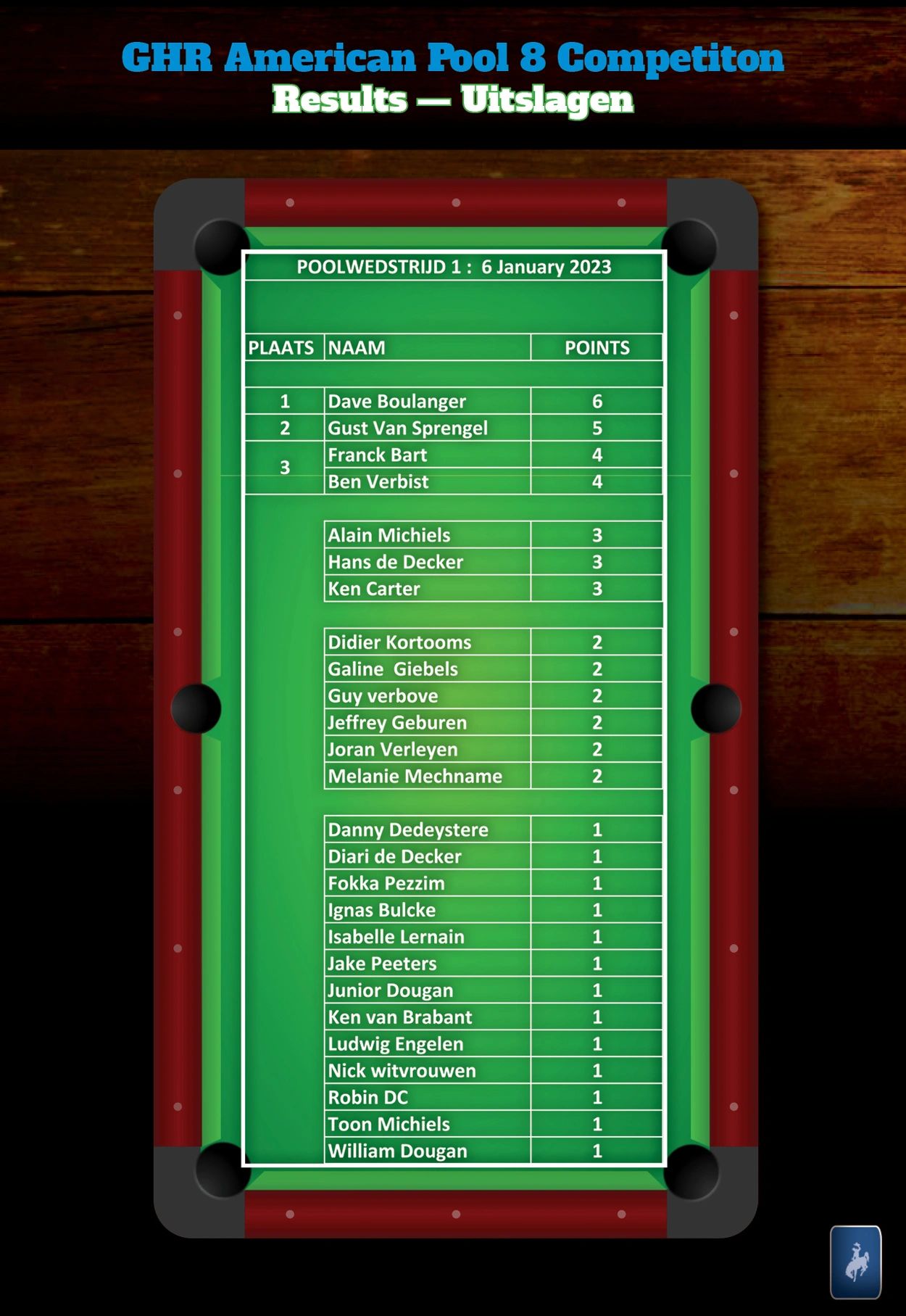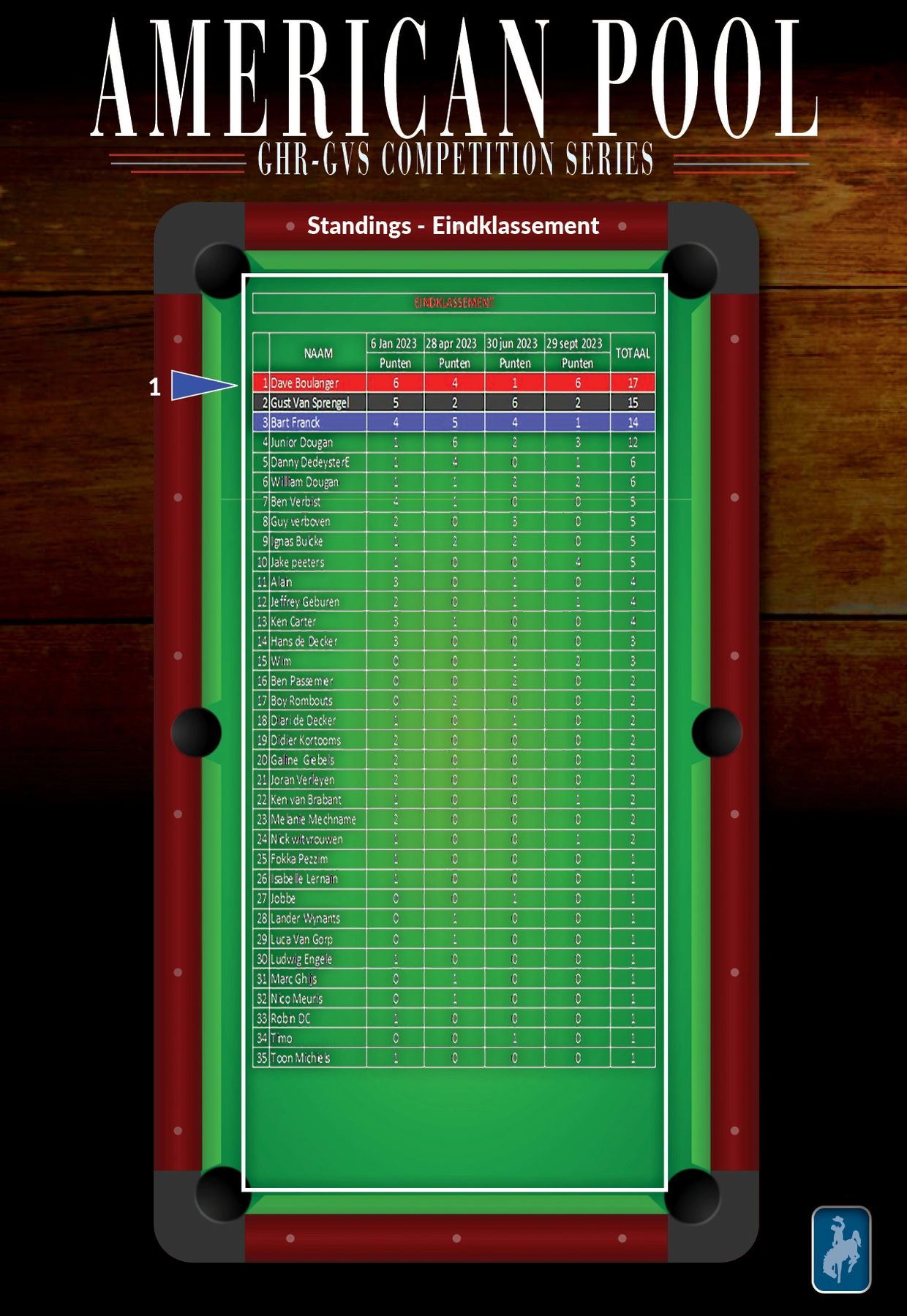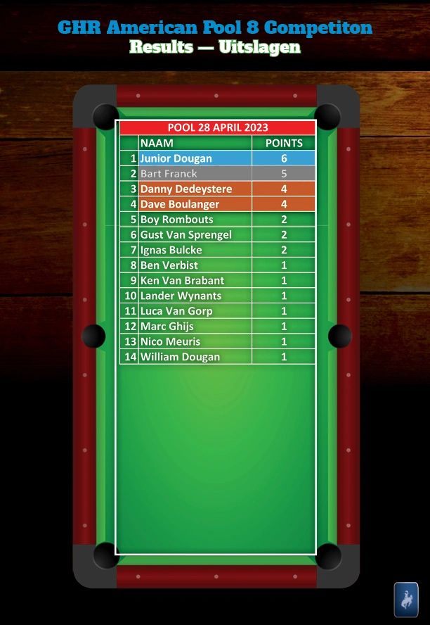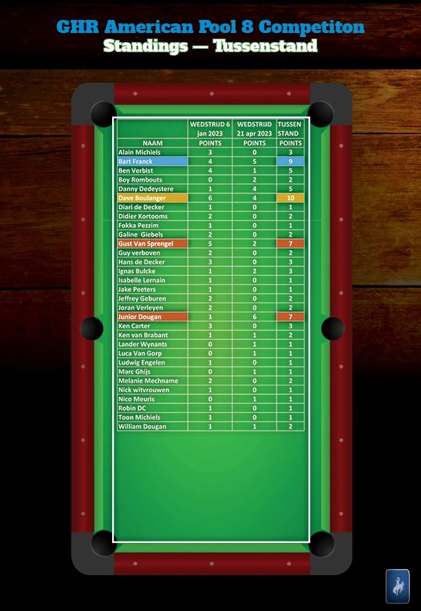 Hiermee wordt een onvergetelijk 2023 AVS-GVS GHR Pool Billiard seizoen afgesloten, dat ook nog een plechtige apotheose zal kennen met de officiële overhandiging van de trofee buckle aan Dave Boulanger. Datum wordt nog bekend gemaakt.