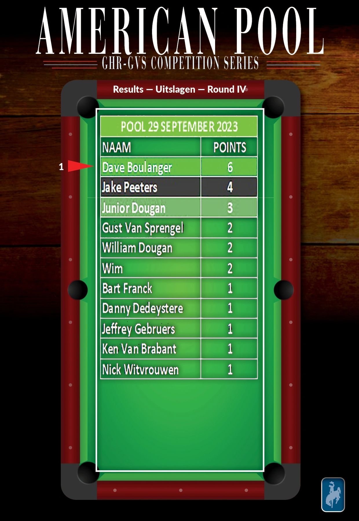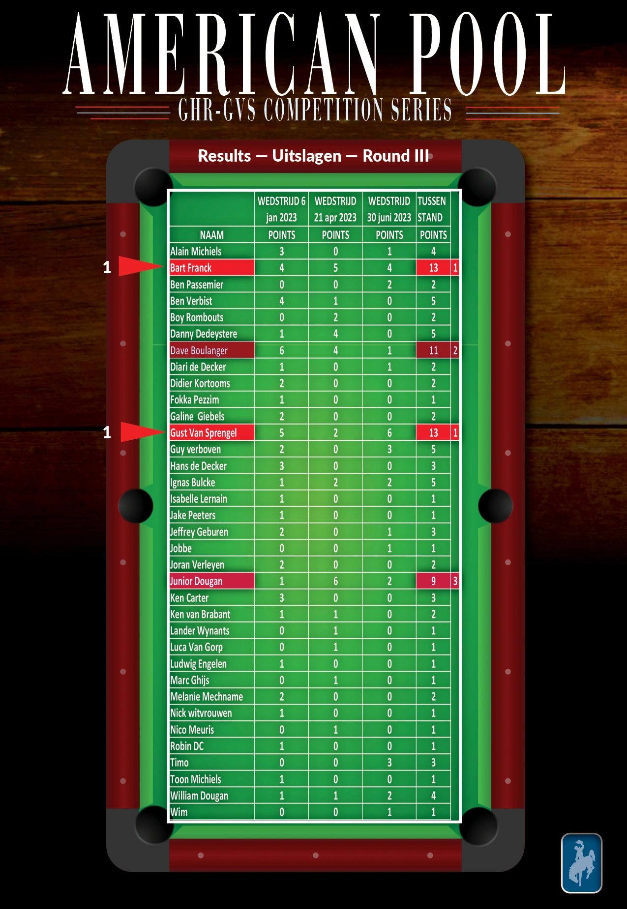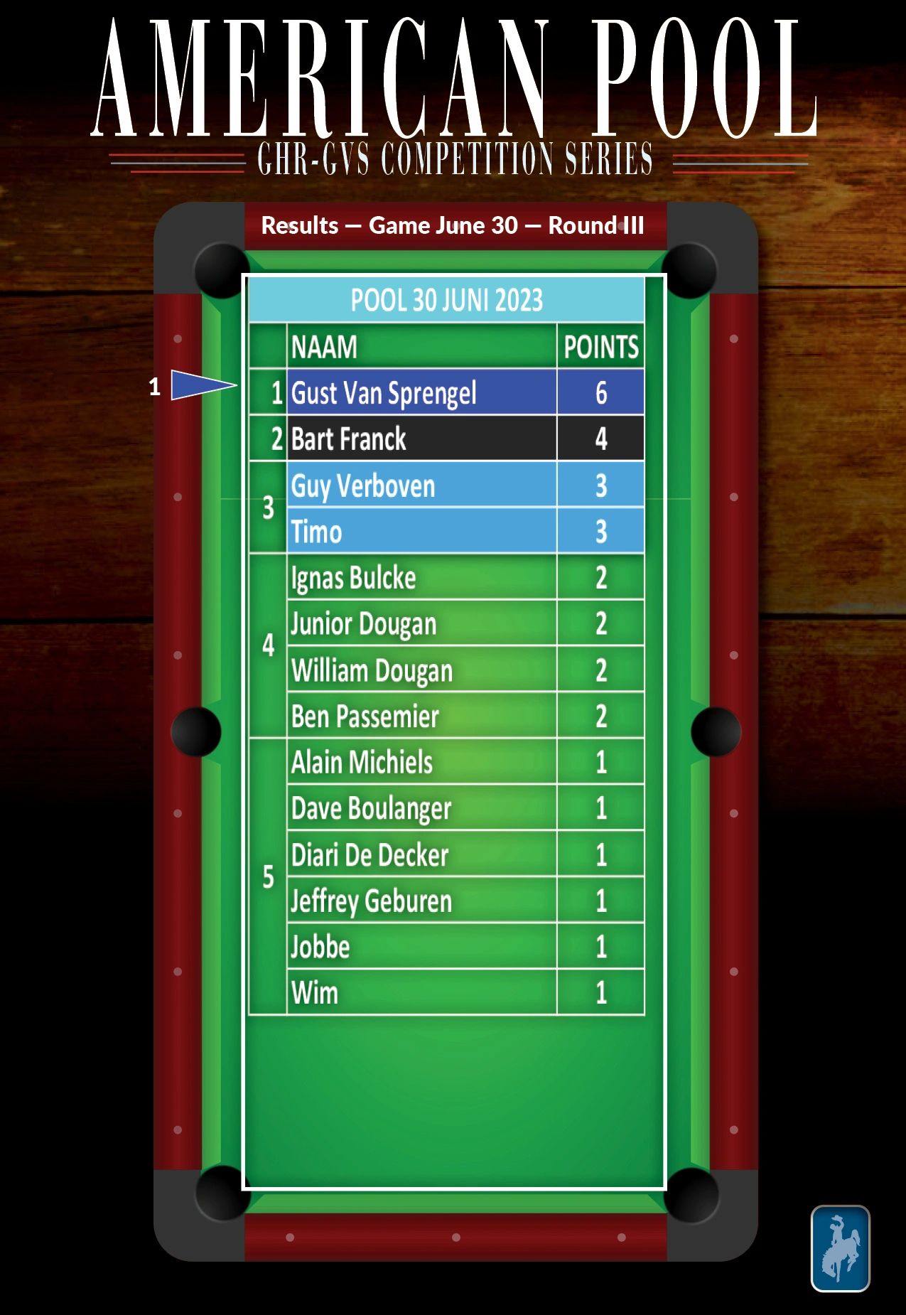 Hiermee wordt een onvergetelijk 2023 AVS-GVS GHR Pool Billiard seizoen afgesloten, dat ook nog een plechtige apotheose zal kennen met de officiële overhandiging van de trofee buckle aan Dave Boulanger. Datum wordt nog bekend gemaakt.